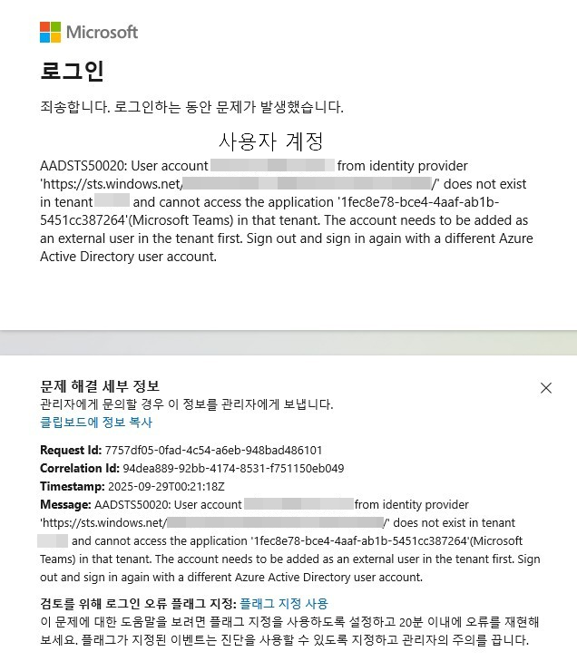 AADSTS50020: User account '사용자 계정 (user@domain.com)' from identity provider ' https://sts.windows.net/{tenant-id}/' does not exist in tenant '테넌트 이름' and coannot access the application 'application GUID' in that tenat.