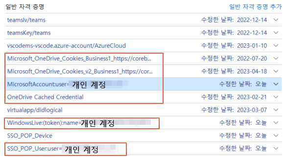- 이곳에서 Office 및 OneDrive 관련 자격 증명을 모두 삭제합니다.
