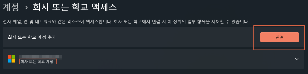 - 설정 → 계정 → 회사 또는 학교 액세스 메뉴로 이동